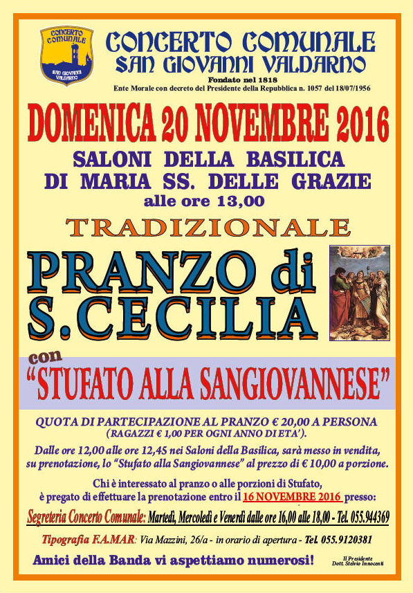 Alle ore 13:00, nei Saloni della Basilica, si terrà il tradizionale Pranzo di S. Cecilia con “Stufato alla sangiovannese”.